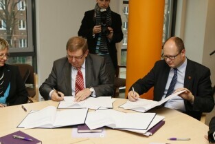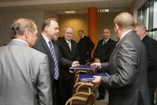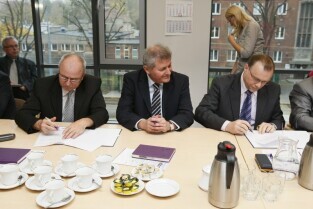 Podpisanie umowy na wykonanie inwestycji "Nowa Łódzka". Umowę podpisali m.in. Prezydent Gdańska Paweł Adamowicz, Prezes GIK Ryszard Trykosko, Prezes MTM SA Marek Ignatowski, Wiceprezes Trakcji Polskiej Tadeusz Bogdan. Gdańsk, siedziba GIK 2012