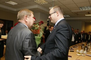 Podpisanie umowy na wykonanie inwestycji "Nowa Łódzka". Nz. z okazji 45-tych urodzin Prezydent Paweł Adamowicz otrzymał bukiet kwiatów od Prezesa GIK Ryszarda Trykosko