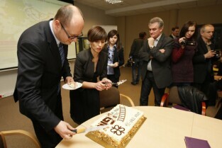 Podpisanie umowy na wykonanie inwestycji "Nowa Łódzka". Umowę podpisali m.in. Prezydent Gdańska Paweł Adamowicz, Prezes GIK Ryszard Trykosko, Prezes MTM SA Marek Ignatowski, Wiceprezes Trakcji Polskiej Tadeusz Bogdan. Gdańsk, siedziba GIK 2012. Nz. krojenie pamiątkowego tortu