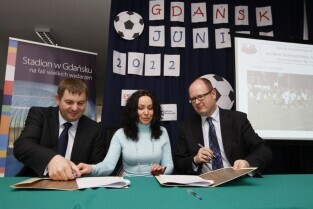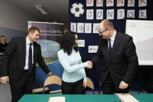 Podpisanie umowy na budowę boiska przy Gimnazjum nr 3 na gdańskim Chełmie w ramach projektu Gdańsk Junior 2012. Budowę sponsoruje firma deweloperska Eurostyl.