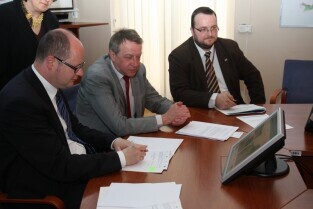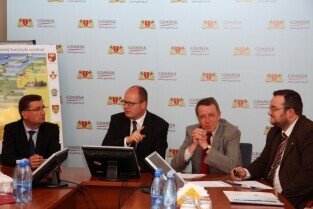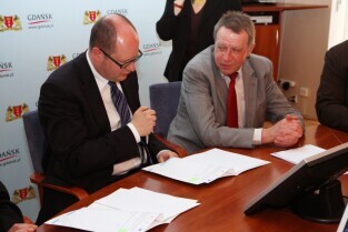 Gdańsk, Urząd Miejski. Podpisanie umowy na budowę mostu zwodzonego w Przegalinie. Budowa przeprawy w Przegalinie to część programu aktywizacji dróg wodnych na drodze wodnej E-70 – w projekcie „Pętla Żuławska – rozwój turystyki wodnej. Etap I”