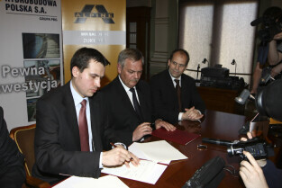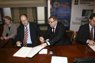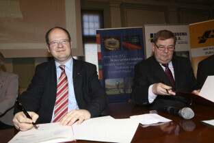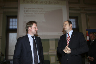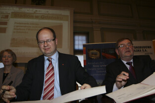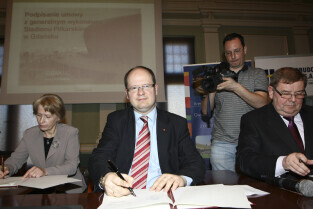 Podpisanie umowy na budowę stadionu w Gdańsku Letnicy pomiędzy spółką BIEG 2012, miastem Gdańsk i konsorcjum Hydrobudowa. Nz. od lewej: Prezes PL2012 Marcin Herra, Prezydent Gdańska Paweł Adamowicz