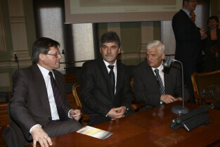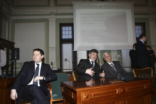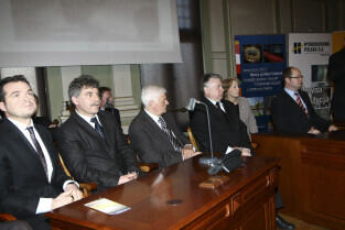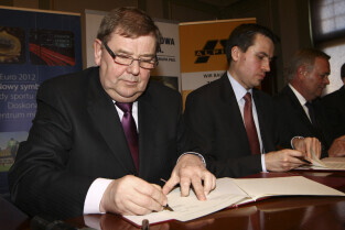 Podpisanie umowy na budowę stadionu w Gdańsku Letnicy pomiędzy spółką BIEG 2012, miastem Gdańsk i konsorcjum Hydrobudowa. Nz. od lewej: Wicewojewoda Pomorski Michał Owczarczak, Wojewoda Pomorski Roman Zaborowski, Marszałek Woj. Pomorskiego Jan Kozłowski