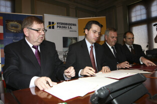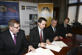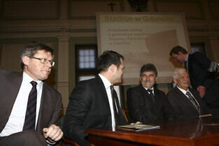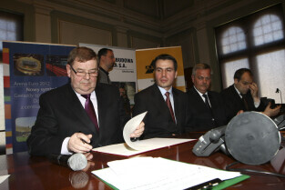 Podpisanie umowy na budowę stadionu w Gdańsku Letnicy pomiędzy spółką BIEG 2012, miastem Gdańsk i konsorcjum Hydrobudowa. Nz. od lewej: Prezes BIEG 2012 Ryszard Tyrkosko, Wiceprezes BIEG 2012 Adam Kalata, Prezes Hydrobudowa S.A. Jerzy Ciechanowski, Prezes Alpine Cersten Hell