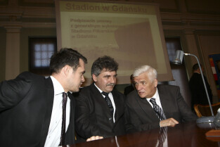 Podpisanie umowy na budowę stadionu w Gdańsku Letnicy pomiędzy spółką BIEG 2012, miastem Gdańsk i konsorcjum Hydrobudowa. Nz. od lewej: Prezes BIEG 2012 Ryszard Tyrkosko, Wiceprezes BIEG 2012 Adam Kalata, Prezes Hydrobudowa S.A. Jerzy Ciechanowski
