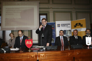 Podpisanie umowy na budowę stadionu w Gdańsku Letnicy pomiędzy spółką BIEG 2012, miastem Gdańsk i konsorcjum Hydrobudowa. Nz. Prezydent Gdańska Paweł Adamowicz