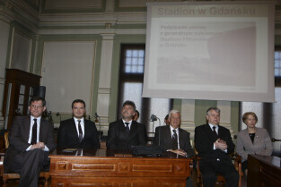 Podpisanie umowy na budowę stadionu w Gdańsku Letnicy pomiędzy spółką BIEG 2012, miastem Gdańsk i konsorcjum Hydrobudowa. Nz. od lewej: Sekretarz Stanu w MSiT Adam Giersz, Wojewoda Pomorski Roman Zaborowski, Marszałek Woj. Pomorskiego Jan Kozłowski