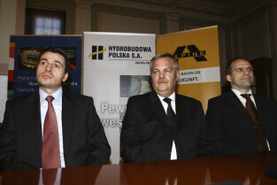 Podpisanie umowy na budowę stadionu w Gdańsku Letnicy pomiędzy spółką BIEG 2012, miastem Gdańsk i konsorcjum Hydrobudowa. Nz. od lewej: Wiceprezes BIEG 2012 Adam Kalata, Prezes Hydrobudowa S.A. Jerzy Ciechanowski, Prezes Alpine Cersten Hell