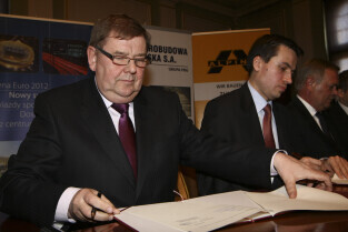 Podpisanie umowy na budowę stadionu w Gdańsku Letnicy pomiędzy spółką BIEG 2012, miastem Gdańsk i konsorcjum Hydrobudowa. Nz. od lewej: Sekretarz Stanu w MSiT Adam Giersz, Sławomir Nowak, Wojewoda Pomorski Roman Zaborowski, Marszałek Woj. Pomorskiego Jan Kozłowski, Marszałek Senatu Bogdan Borusewicz, Skarbnik Miasta Gdańska Teresa Blacharska