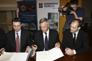 Podpisanie umowy na budowę stadionu w Gdańsku Letnicy pomiędzy spółką BIEG 2012, miastem Gdańsk i konsorcjum Hydrobudowa. Nz. od lewej: Sławomir Nowak, Wojewoda Pomorski Roman Zaborowski, Marszałek Woj. Pomorskiego Jan Kozłowski
