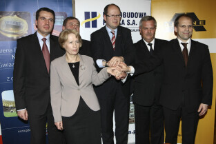 Podpisanie umowy na budowę stadionu w Gdańsku Letnicy pomiędzy spółką BIEG 2012, miastem Gdańsk i konsorcjum Hydrobudowa. Nz. od lewej: Sławomir Nowak, Ryszard Tyskosko, Teresa Blacharska, Paweł Adamowicz, Jerzy Ciechanowski, Cersten Hell