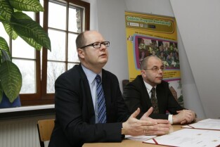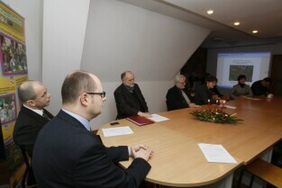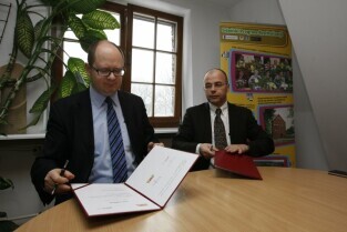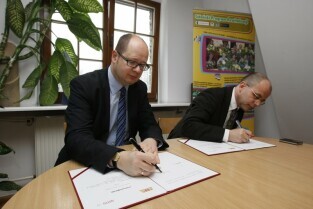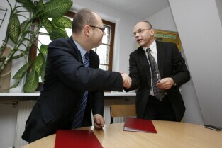 Podpisanie umowy pomiędzy Miastem Gdańsk, a firmą AMS SA na wspólne zorganizowanie konkursu - koncepcji zagospodarowania Placu Wałowego. Gdańsk, Wydział Rzeźby ASP. Nz. Prezydent Gdańska Paweł Adamowicz i W-ce Prezes AMS SA Marek Kazuka