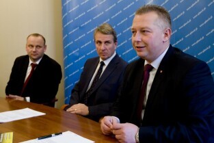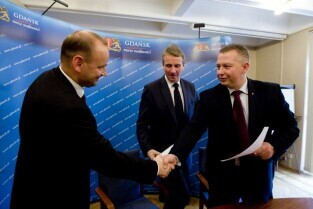 Podpisanie umowy na dofinansowanie przebudowy układu drogowego przy centrum handlowym Auchan. Nz. od prawej: Z-ca Prezydenta Gdańska Andrzej Bojanowski, Dyrektor Generalny Auchan Polska Marek Szeib, Dyrektor Techniczny Auchan Polska Artur Dobiesław Zawieska