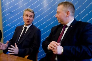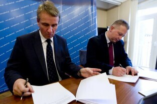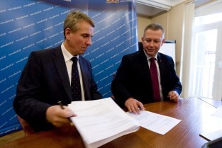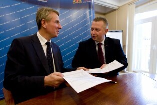 Podpisanie umowy na dofinansowanie przebudowy układu drogowego przy centrum handlowym Auchan. Nz. od prawej: Z-ca Prezydenta Gdańska Andrzej Bojanowski, Dyrektor Generalny Auchan Polska Marek Szeib