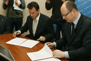 Gdańsk, Urząd Miejski. Podpisanie umowy na realizację systemów IT na stadionie w Letnicy pomiędzy firmą TRIAS S.A., spółką BIEG2012 i miastem Gdańskiem. Nz. od lewej: Prezydent Gdańska Paweł Adamowicz, Skarbnik Gdańska Teresa Blacharska, Prezes BIEG2012 Ryszard Tyrkosko