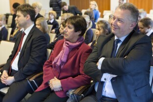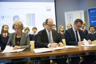Gdański Park Naukowo-Technologiczny. Podpisanie umowy najmu budynku przy ul. Azaliowej 18 w Gdańsku Kokoszkach, w którym we wrześniu powstanie szkoła podstawowa. Nz. od lewej: Skarbnik Miasta Gdańska Teresa Blacharska, Prezydent Gdańska Paweł Adamowicz, Prezes Pozytywnych Inicjatyw (przyszłego operatora) Arkadiusz Gawrych