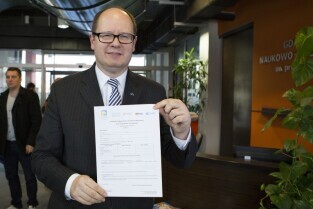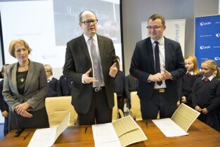 Gdański Park Naukowo-Technologiczny. Podpisanie umowy najmu budynku przy ul. Azaliowej 18 w Gdańsku Kokoszkach, w którym we wrześniu powstanie szkoła podstawowa. Nz. po prawej Z-ca Prezydenta Gdańska Andrzej Bojanowski