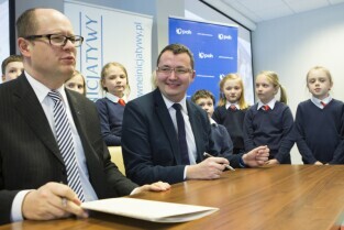 Gdański Park Naukowo-Technologiczny. Podpisanie umowy najmu budynku przy ul. Azaliowej 18 w Gdańsku Kokoszkach, w którym we wrześniu powstanie szkoła podstawowa. Nz. od lewej: Prezydent Gdańska Paweł Adamowicz, Prezes Pozytywnych Inicjatyw (przyszłego operatora) Arkadiusz Gawrych