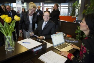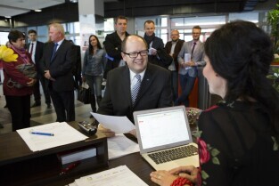 Gdański Park Naukowo-Technologiczny. Podpisanie umowy najmu budynku przy ul. Azaliowej 18 w Gdańsku Kokoszkach, w którym we wrześniu powstanie szkoła podstawowa. Nz. Prezydent Gdańska Paweł Adamowicz odwiedza punkt konsultacyjny dla rodziców dotyczący naboru do nowej szkoły