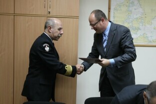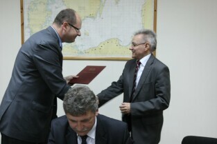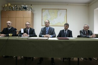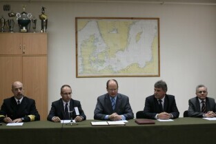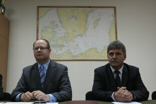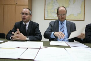 Powołanie Rady ds. Pola Bitwy Westerplatte przy Prezydencie Miasta Gdańska oraz podpisanie umowy o współpracy z dyrektorem Muzeum II Wojny Światowej dotyczącej korzystania z terenu dawnej polskiej placówki. Westerplatte, Komenda Oddziału Straży Granicznej w Gdańsku. Nz. od lewej: Prezydent Gdańska Paweł Adamowicz, Wojewoda Pomorski Roman Zaborowski