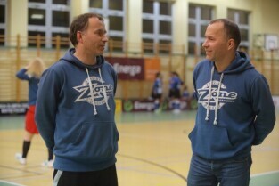 Unihokej Energa Olimpia Osowa - PKS MOS Zbąszyń. Nz (L) Piotr Ludwichowski-Wiceprezes Energa Olimpia Osowa i (P) Paweł Ludwichowski Trener Energa Olimpia Osowa.