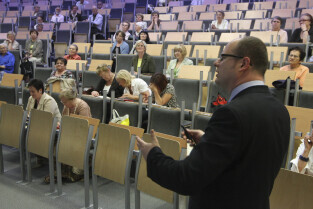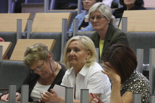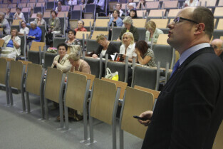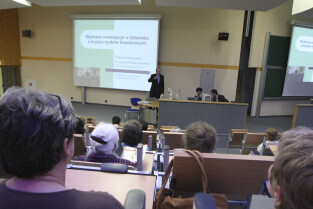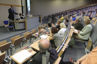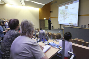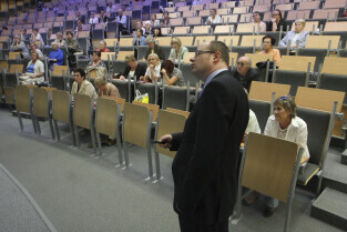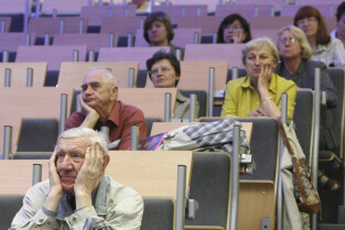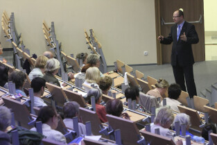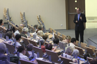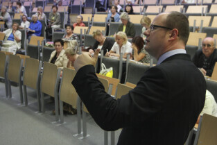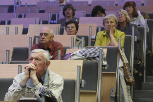 Uniwersytet III Wieku - wykład Prezydenta Gdańska Pawła Adamowicza o inwestycjach w Gdańsku. Uniwersytet Gdański, aula Wydziału Nauk Społecznych