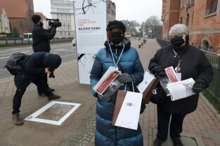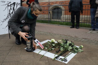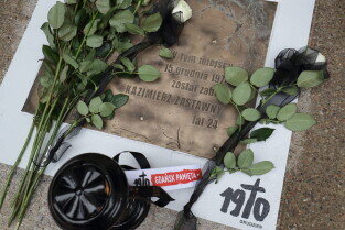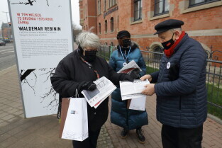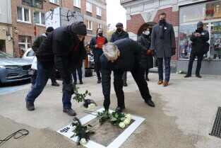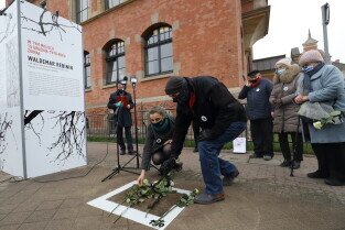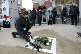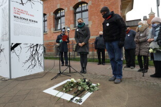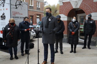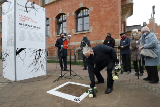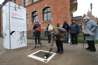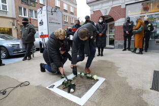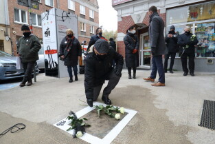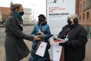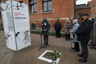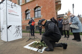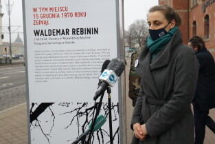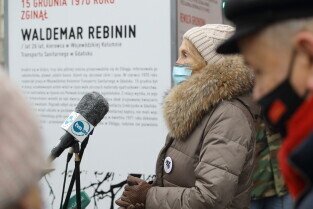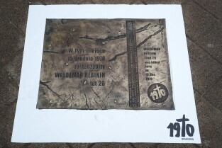 Gdańsk. Uroczyste odsłonięcie Płyt upamiętniających miejsca śmierci Ofiar Grudnia 1970. Nz. Odsłonięcie płyty upamiętniającej Waldemara Rebinina.