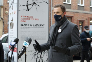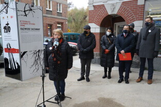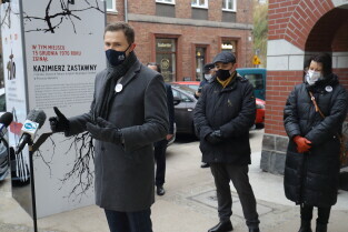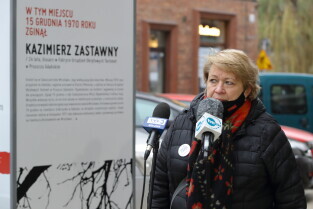 Gdańsk. Uroczyste odsłonięcie Płyt upamiętniających miejsca śmierci Ofiar Grudnia 1970. Nz. Odsłonięcie płyty upamiętniającej Kazimierza Zastawnego.