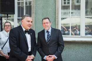 Gdańsk, ul. Garbary. Uroczyste odsłonięcie tablicy pamiątkowej Leopolda von Wintera. Nz. Thomas von Winter i Prezydent Gdańska Paweł Adamowicz