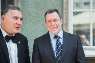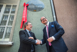 Gdańsk, ul. Garbary. Uroczyste odsłonięcie tablicy pamiątkowej Leopolda von Wintera. Nz. Prezydent Gdańska Paweł Adamowicz i Dyrektor Muzeum Gdańska Waldemar Ossowski