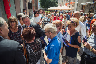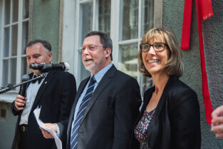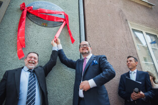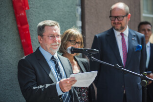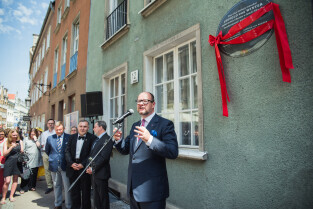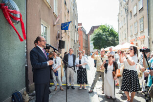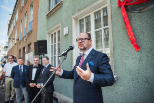 Gdańsk, ul. Garbary. Uroczyste odsłonięcie tablicy pamiątkowej Leopolda von Wintera. Nz. Prezydent Gdańska Paweł Adamowicz