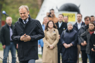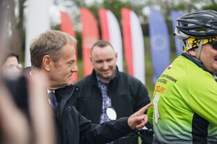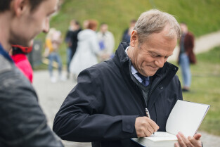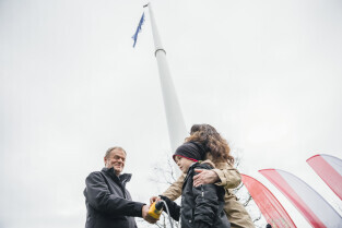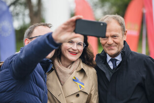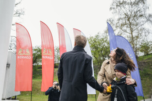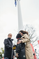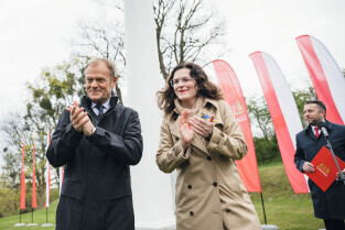 Gdańsk. Uroczyste podniesienie flagi europejskiej na maszt Góry Gradowej. 1 maja 2022 roku mija 18 lat od wstąpienia Polski do Unii Europejskiej. Przemawiali prezydent Aleksandra Dulkiewicz i Donald Tusk