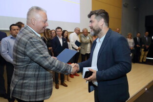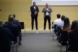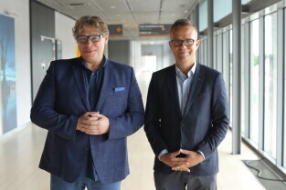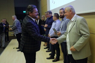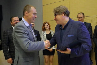 Gdańsk, AmberExpo. Uroczyste podsumowanie akcji "Posiłek za wysiłek". Nz. Andrzej Bojanowski - prezes zarządu AmberExpo i Paweł Orłowski - wiceprezes zarządu AmberExpo.
