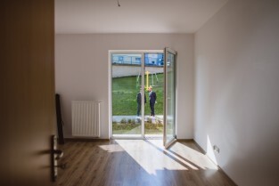 Uroczyste wręczenie kluczy do mieszkań przy ul. Madalińskiego na gdańskim Chełmie. Nz pokój z wyjściem na ogród.