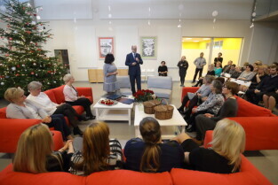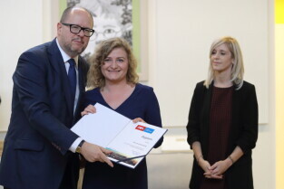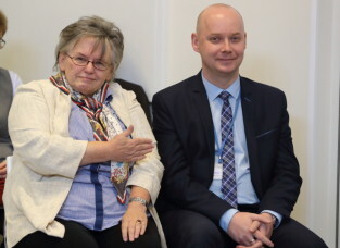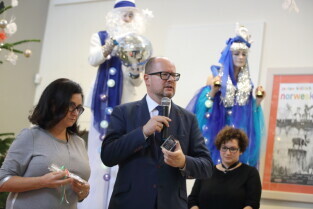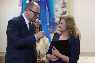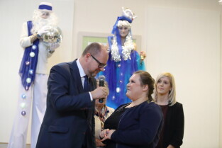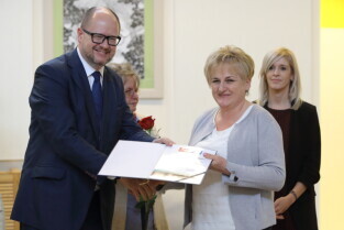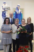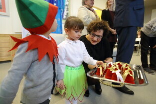 Gdańsk, Żłobek „Dzwoneczek”. Uroczyste wręczenie tytułu Opiekunki Roku. Nz. Radna Teresa Wasilewska i Grzegorz Kryger-Wydział Rozwoju Społecznego.