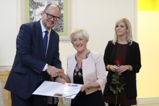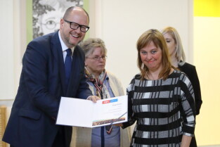 Gdańsk, Żłobek „Dzwoneczek”. Uroczyste wręczenie tytułu Opiekunki Roku. Nz. Radna Emilia Lodzińska i Prezydent Gdańska Paweł Adamowicz.