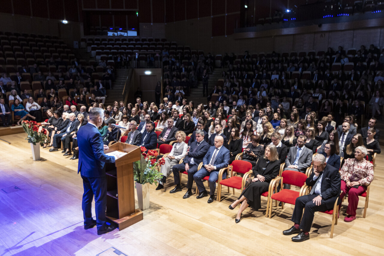 Gdańsk. Wicewojewoda pomorski Anna Olkowska-Jacyno, Prezydent Gdyni Aleksandra Kosiorek oraz Piotr Borawski, Z-ca Prezydenta ds. mobilności i bezpieczeństwa uczestniczyli w uroczystości z okazji nadania praw do wykonywania zawodu Lekarza i Lekarza Dentysty., która odbyła się w Filharmonii Bałtyckiej na Ołowiance. Nz. Przy mikrofonie Lek. dent. Dariusz, Prezes Okręgowej Izby Lekarskiej.