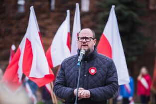 Gdańsk, Pomnik Tym co za polskość Gdańska. Uroczystość 72. rocznicy zakończenia II wojny światowej. Nz. Paweł Adamowicz Prezydent Miasta Gdańska