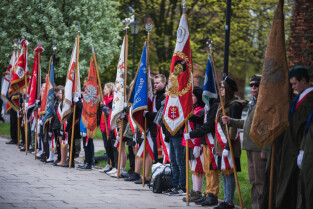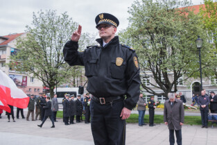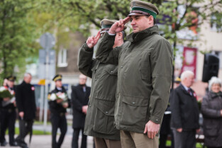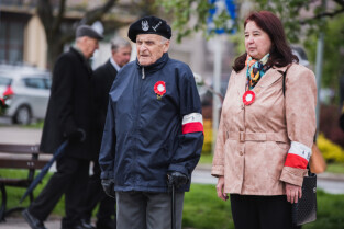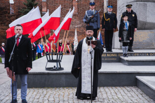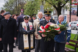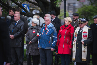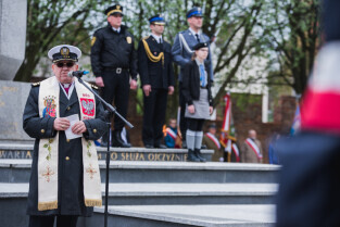 Gdańsk, Pomnik Tym co za polskość Gdańska. Uroczystość 72. rocznicy zakończenia II wojny światowej. Nz. Ks. Prałat kmdr dr Marian Próchniak
