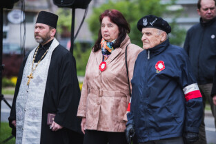 Gdańsk, Pomnik Tym co za polskość Gdańska. Uroczystość 72. rocznicy zakończenia II wojny światowej. Nz. po prawej ks. prot. Dariusz Jóźwik proboszcz prawosławnej Parafii Św. Mikołaja w Gdańsku