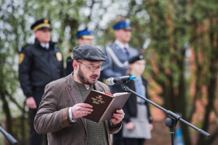 Gdańsk, Pomnik Tym co za polskość Gdańska. Uroczystość 72. rocznicy zakończenia II wojny światowej. Nz. Jakub Skrzypczak - Gmina Wyznania Mojżeszowego w RP