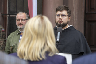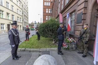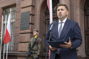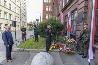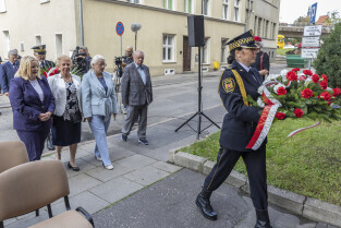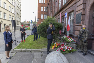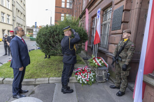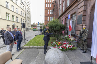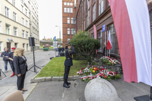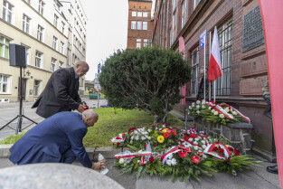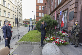 Uroczystość Victoriaschule, przy tablicy upamiętniającej Polaków torturowanych i zamęczonych w pierwszych dniach II Wojny Światowej