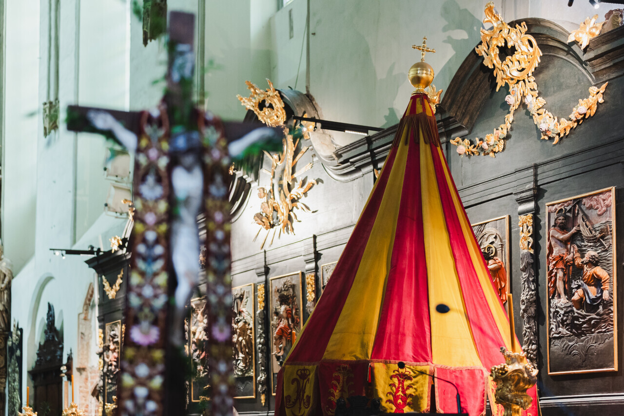 Gdańsk. Uroczystość ku czci zmarłego papieża Frańciszka. W bazylice św. Mikołaja zakonnicy otworzyli umbraculum - żółto-czerwony parasol liturgiczny