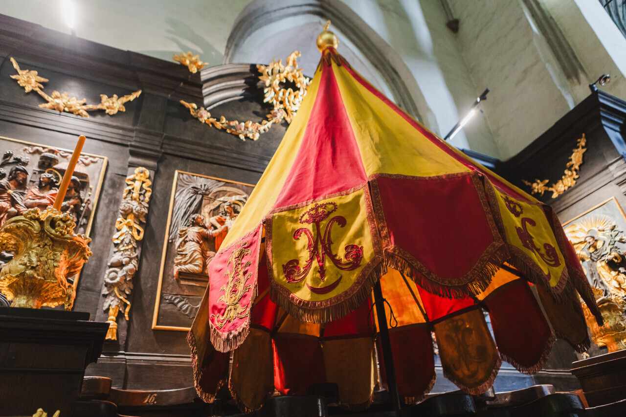 Gdańsk. Uroczystość ku czci zmarłego papieża Frańciszka. W bazylice św. Mikołaja zakonnicy otworzyli umbraculum - żółto-czerwony parasol liturgiczny