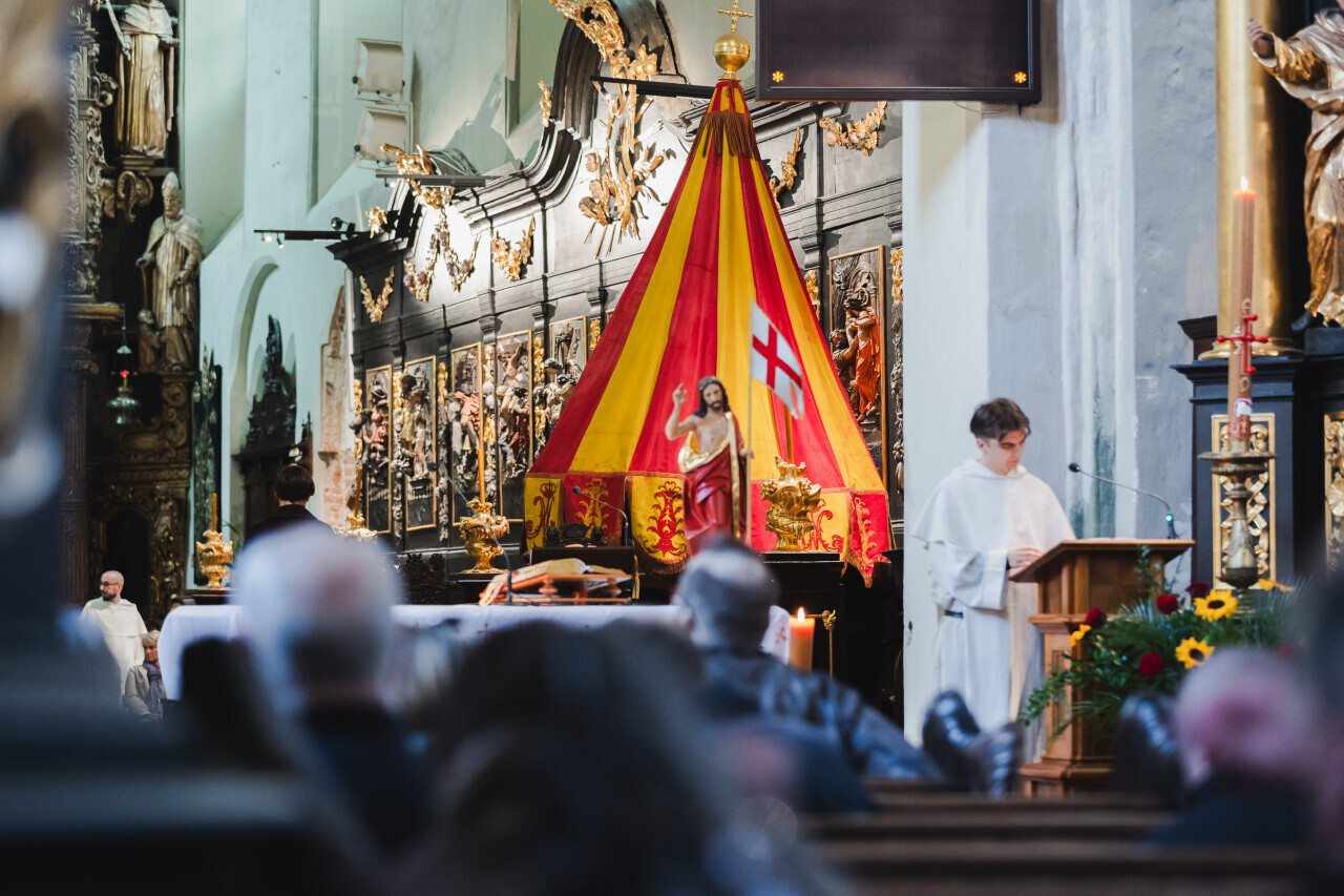Gdańsk. Uroczystość ku czci zmarłego papieża Frańciszka. W bazylice św. Mikołaja zakonnicy otworzyli umbraculum - żółto-czerwony parasol liturgiczny