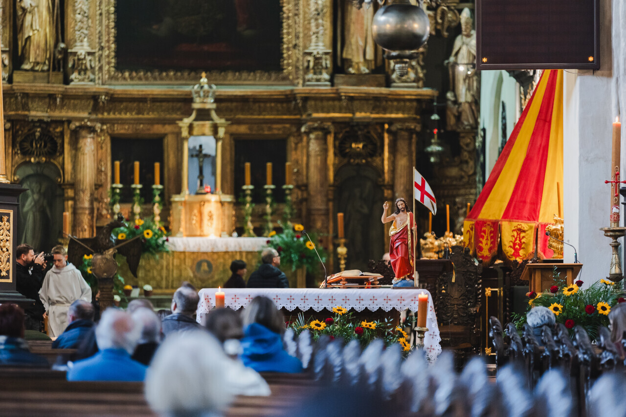Gdańsk. Uroczystość ku czci zmarłego papieża Frańciszka. W bazylice św. Mikołaja zakonnicy otworzyli umbraculum - żółto-czerwony parasol liturgiczny