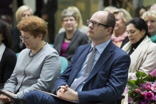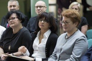 Gdańsk Osowa. Uroczystość nadania imienia Stefana Banacha Gimnazjum nr 33 i XXIV Liceum Ogólnokształcącemu, czyli Zespołowi Szkół Ogólnokształcących nr 2. Nz. lewej: Z-ca Dyrektora Wydziału Rozwoju Społecznego UMG Mariola Paluch, Radna Miasta Gdańska Żaneta Geryk, Pomorski Kurator Oświaty Elżbieta Wasilenko