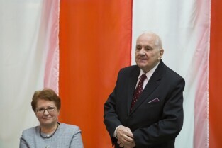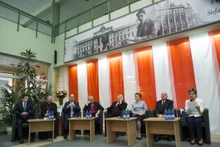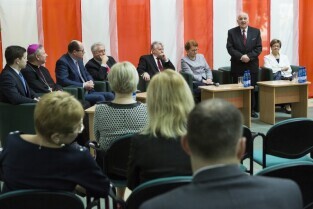 Gdańsk Osowa. Uroczystość nadania imienia Stefana Banacha Gimnazjum nr 33 i XXIV Liceum Ogólnokształcącemu, czyli Zespołowi Szkół Ogólnokształcących nr 2. Nz. od lewej: Biskup pomocniczy Archidiecezji Gdańskiej Wiesław Szlachetka, Marszałek Senatu RP Bogdan Borusewicz, prof. Janusz Rachoń