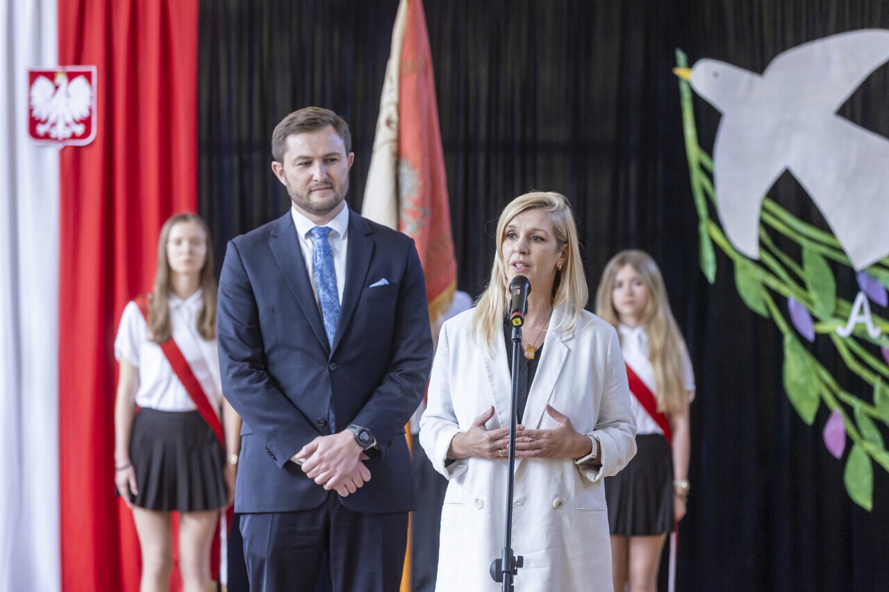 Gdańsk. Uroczystość nadania nowego sztandaru w szkole podstawowej nr 45 im. Bohaterów Westerplatte. W Uroczystości Udział wzięli między innymi Emilia Lodzińska, Zastępczyni Prezydenta Miasta Gdańska ds. rozwoju przestrzennego i mieszkalnictwa oraz Piotr Grzelak, Z-ca Prezydenta ds. zrównoważonego rozwoju i gospodarki.