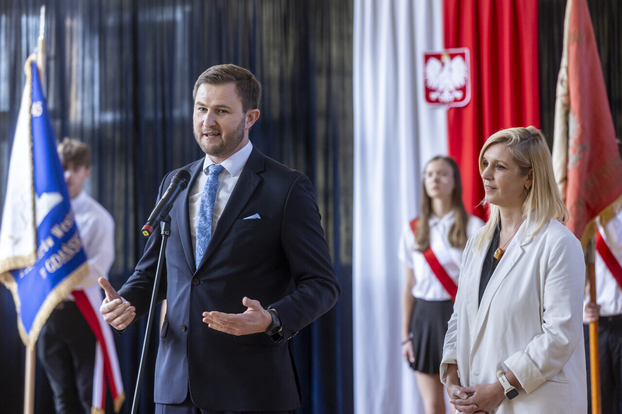 Gdańsk. Uroczystość nadania nowego sztandaru w szkole podstawowej nr 45 im. Bohaterów Westerplatte. W Uroczystości Udział wzięli między innymi Emilia Lodzińska, Zastępczyni Prezydenta Miasta Gdańska ds. rozwoju przestrzennego i mieszkalnictwa oraz Piotr Grzelak, Z-ca Prezydenta ds. zrównoważonego rozwoju i gospodarki.